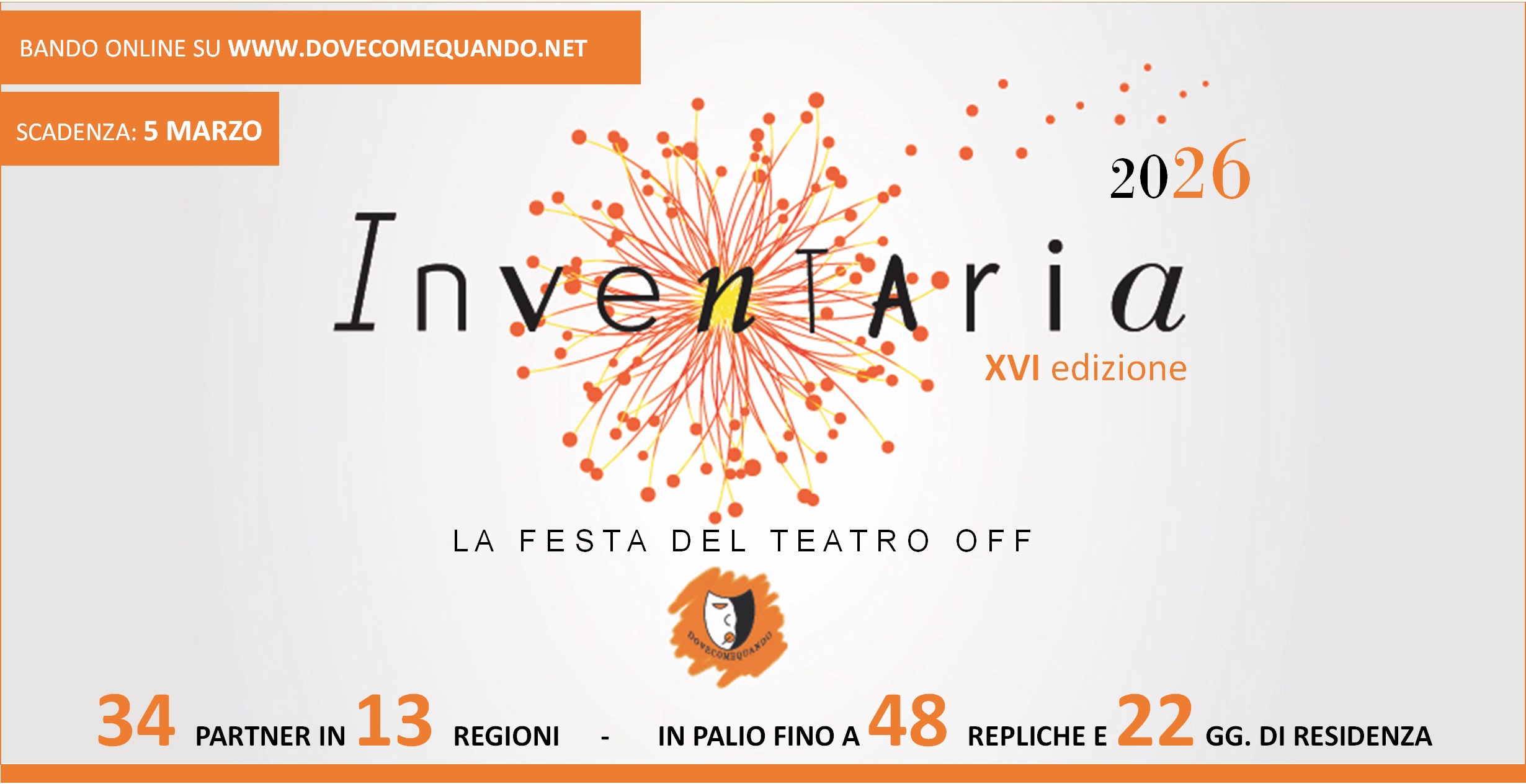 Sul bando di INVENTARIA 2026 - in breve 34 partner in 13 regioni d'Italia mettono in palio fino a 48 repliche e 22 giorni di residenza per gli Spettacoli e le Demo che parteciperanno a Inventaria 2026, il festival di teatro off più off che c'è, con la direzione artistica di Pietro Dattola per gli Spettacoli e Flavia Germana de Lipsis per le Demo. Il bando prevede anche 500 euro di premio per la Demo vincitrice e abbonamenti, buoni e consulenze gratuite offerti rispettivamente da Hystrio, Dino Audino Editore e ScriptDoctor & PlayDoctor.
