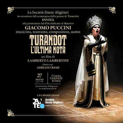 Anteprima nazionale il 27 marzo alle 17 al Cinema Farnese: cento anni dopo la prima alla Scala A cent'anni dalla sua prima rappresentazione al Teatro alla Scala, la Società Dante Alighieri presenta in anteprima assoluta il docufilm Turandot. L'appuntamento è per venerdì 27 marzo 2026 alle ore 17:00 al Cinema Farnese, in Piazza Campo de' Fiori 56, a Roma. «Con questa produzione – dichiara il Segretario generale della Società Dante Alighieri Alessandro Masi – abbiamo voluto rappresentare un Puccini più vicino alla sua vera essenza teatrale e drammaturgica: un grande narratore che, con le sue grandi composizioni musicali, porta l’italofonia nel mondo». Prodotto dalla Società Dante Alighieri, il docufilm è realizzato dal regista Lamberto Lambertini, ideato con il maestro Adriano Bassi e scritto con l'unità Cultura della Società Dante Alighieri. Turandot. L'ultima nota racconta il capolavoro incompiuto cui Giacomo Puccini dedicò le sue ultime energie: un percorso tra memoria e sogno che lascia emergere l'inclinazione drammaturgico-teatrale del compositore di Lucca. La storia di Turandot, la bella e spietata principessa della Cina che sottopone i pretendenti alla soluzione di tre enigmi pena la decapitazione per vendicare lo stupro subito mille anni prima da un'antenata, è universalmente nota. Giacomo Puccini nasce a Lucca nel 1858, in una famiglia di musicisti. Debutta nel 1884 con l'opera Le Villi. Tra il 1893 e il 1924 compone capolavori come La Bohème, Tosca e Madama Butterfly, riuscendo a fondere dramma e poesia in melodie indimenticabili. Muore a Bruxelles nel 1924 mentre ancora sta lavorando all'incompiuta Turandot. La produzione ringrazia il Comune di Santa Maria Capua Vetere per la concessione del Teatro Garibaldi durante le riprese del film e per il patrocinio gratuito offerto all’opera. L'evento del 27 marzo è sostenuto dal Consorzio Parmigiano Reggiano.