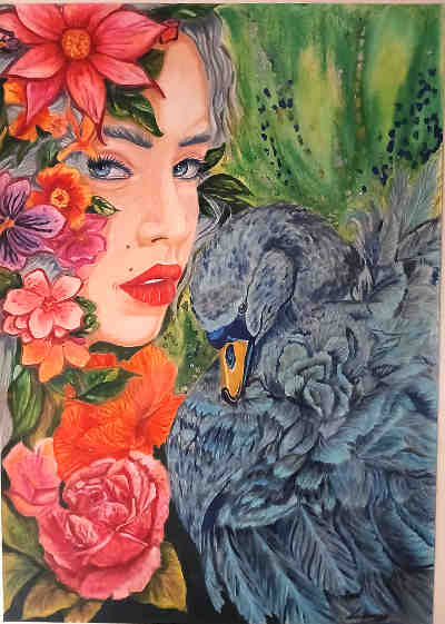 - Bianchi Laura, La fanciulla e il cigno blu, 2025, matite caran d'ache lumiance e museum, tempera fine, pastello secco e foglia oro su carta, cm. 40x30